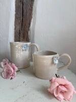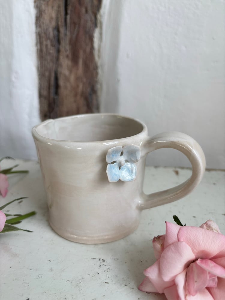 My handbuilt stoneware wrap mugs have a seam down the side. These have hydrangea flowers in blue on the side.
