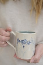 Pressed botanical stoneware cup with flowers from the garden picked out in cobalt blue. The inside is finished in a sea green glossy glaze. Design may vary slightly to the picture.