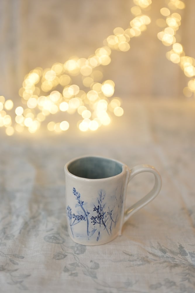 Pressed botanical stoneware cup with flowers from the garden picked out in cobalt blue. The inside is finished in a sea green glossy glaze. Design may vary slightly to the picture.