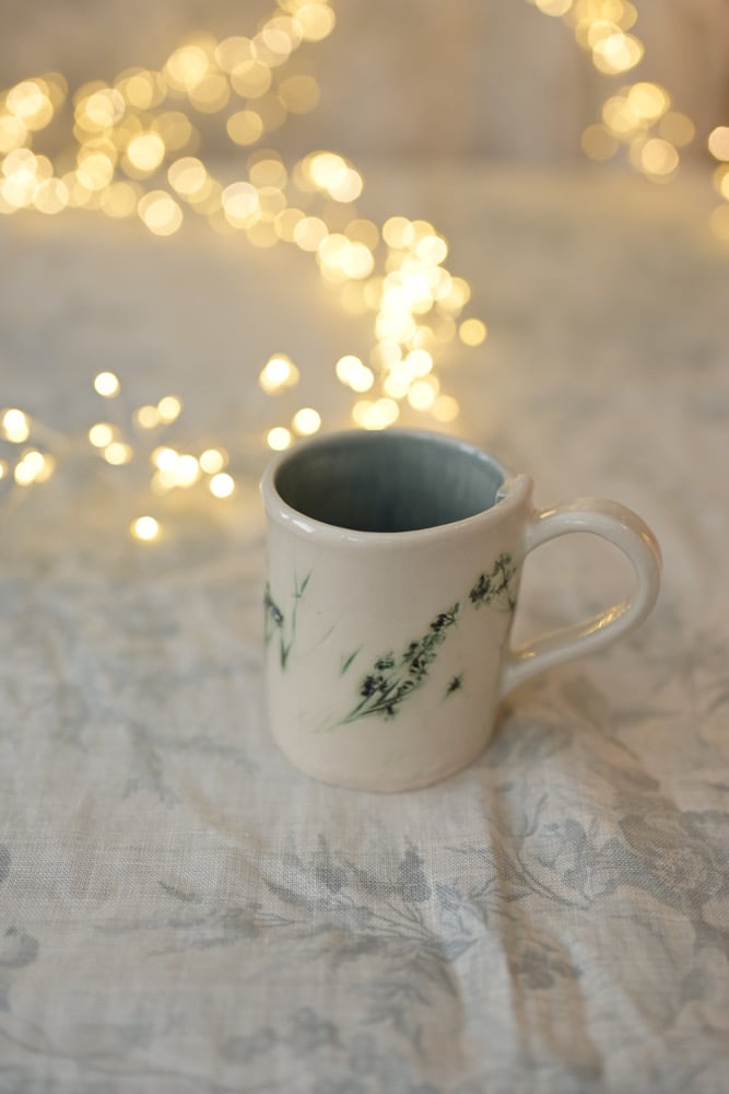 Pressed botanical stoneware cup with flowers from the garden picked out in a deep green. The inside is finished in a sea green glossy glaze. This is a seconds but is still beautiful and useable. See second picture- slight pin-prick area where the glaze has flawed in the kiln.