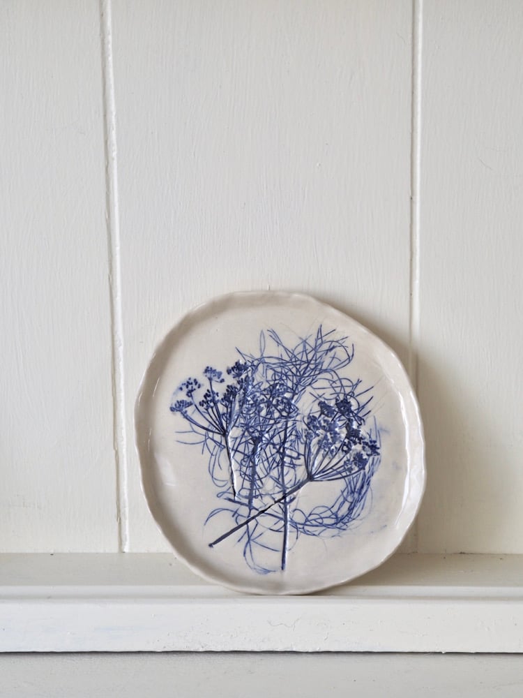 Pressed botanical stoneware plate with flowers from the garden, stained in cobalt blue and finished with a glossy transparent glaze.