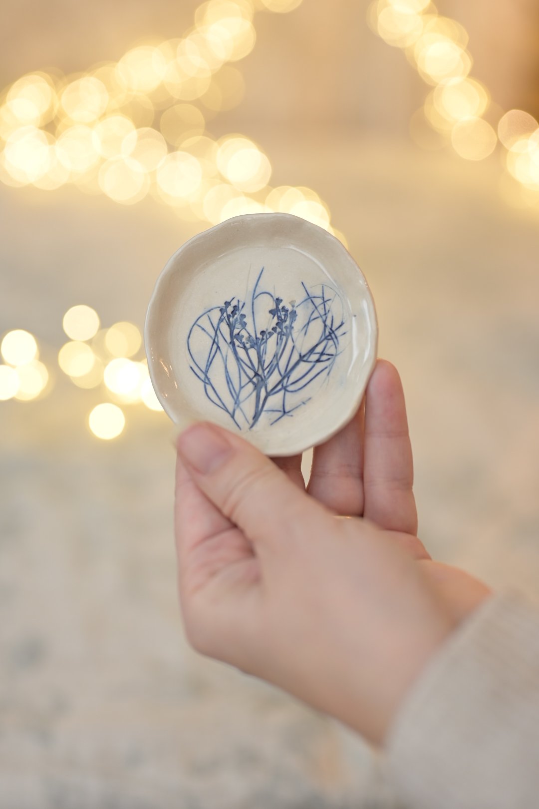 Cute little stoneware dish, perfect for rings. Pressed with garden flowers and stained in cobalt blue.