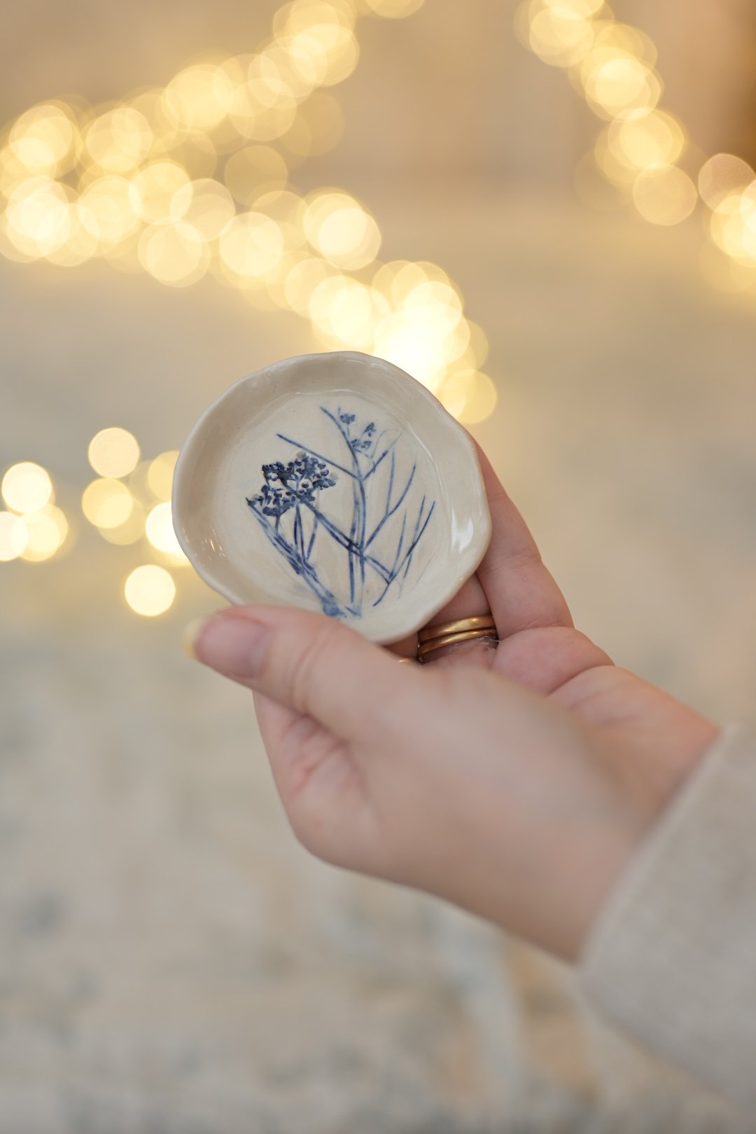 Cute little stoneware dish, perfect for rings. Pressed with garden flowers and stained in cobalt blue.