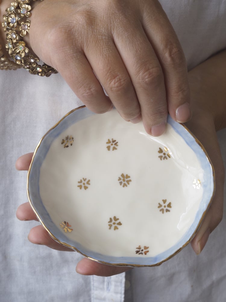 Lovely small dish made from porcelain, hand painted with a blue stripe and gold forget-me-not flowers. A signature design in a new colour.
