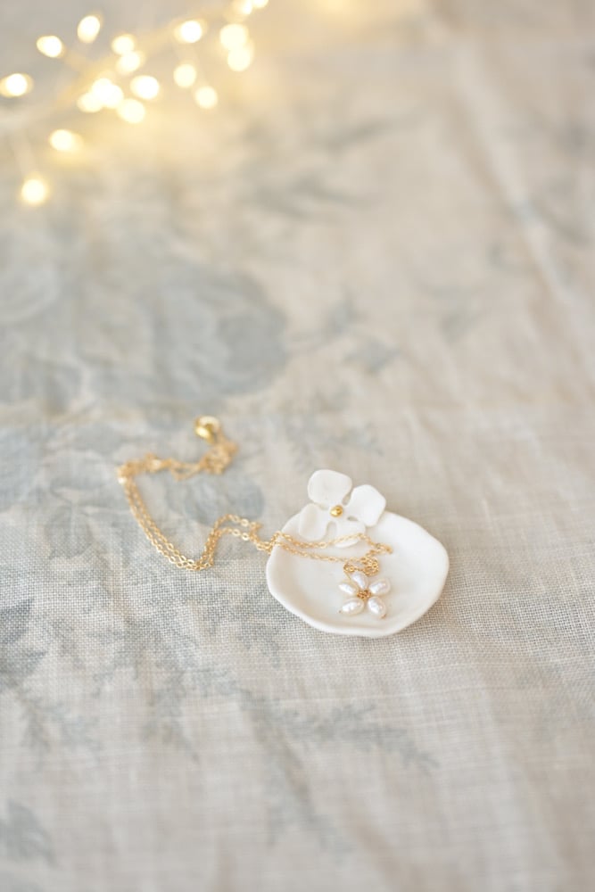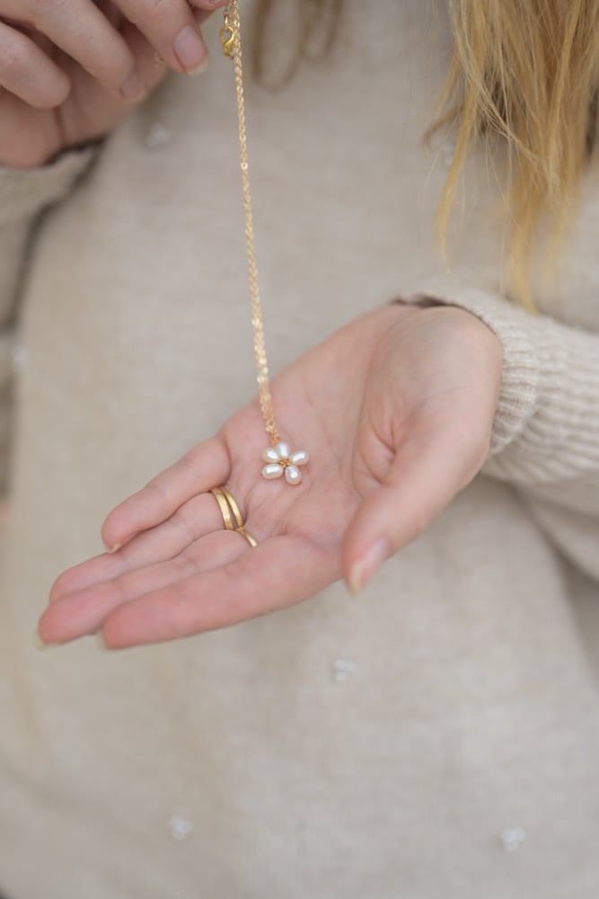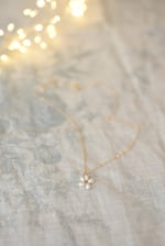 Made by Lilly who designs and makes wire wrapped jewellery. These fresh water pearls have been made into a daisy design and are on a gold plated chain of 24cm