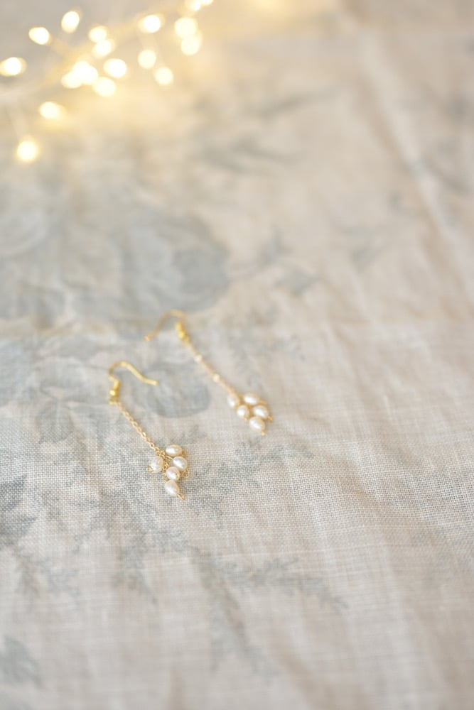 Made by Lilly who designs and makes wire wrapped jewellery. These fresh water pearls are are on gold plated chain with a gold plated ear hooks.