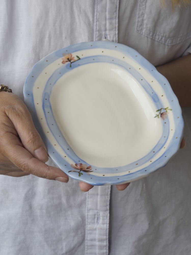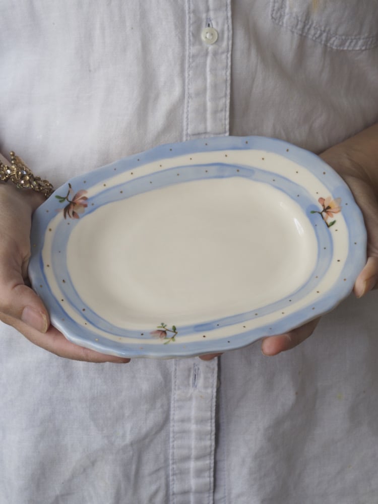 Hand painted blue stripes and gold polka-dots, featuring little magnolia flowers.