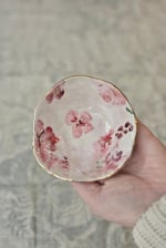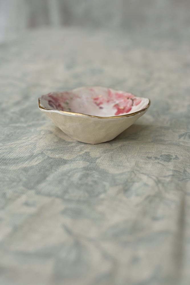 Little dish showing the marks of the maker, Painted petals and finished with gold details.