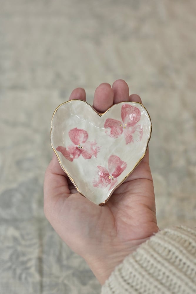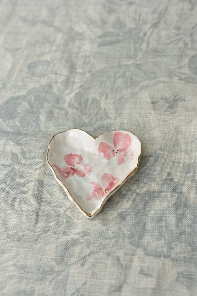 Little heart dish showing the marks of the maker, Painted petals and finished with gold details.