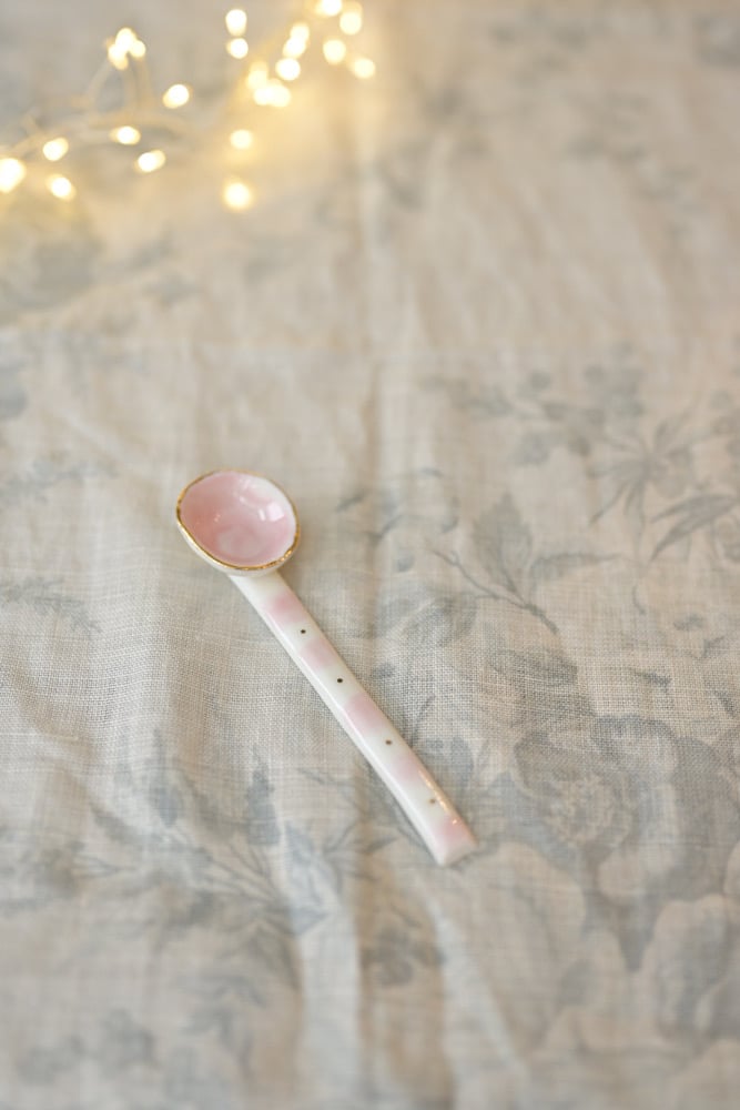 These quirky porcelain spoons have delicate pink stripes and hand painted gold polka-dots. Lovely for jam and cream at a tea party.