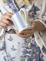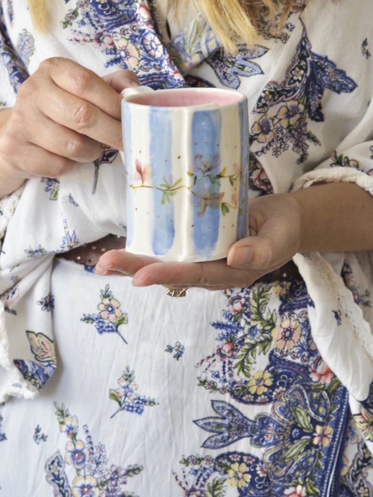 My signature wrap mug made from porcelain with a seam running down one side and scroll handle. This one has hand painted blue stripes and gold polka-dots, It’s also decorated with a magnolia branch.